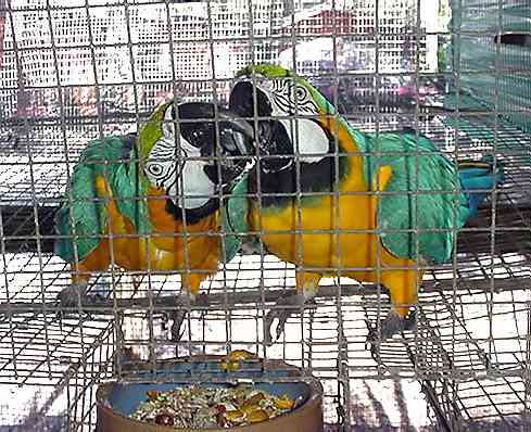 BLUE & GOLD - Proven hen - unproven male - Joe's Ma & Louie Hen is proven since 1992 with GW male she was purchased with, sat & fed with him. Re-paired with B&G male 2006, bonded quickly, chewed through 1st nestbox in several weeks which was not replaced until recently, no production together yet, perfect feather |