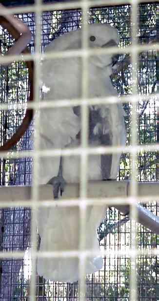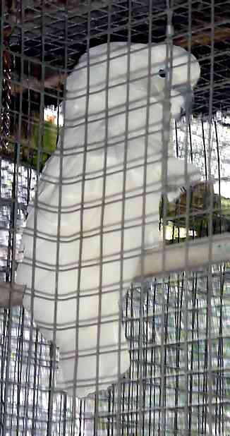 UMBRELLA - egg-laying hen - (Daisy) Purchased 2002, paired with male that chewed box loose from cage and died due to broken jaw. This hen is very shy and takes considerable time to trust males, have not tried her with any of our unpaired males as of yet. Plucks chest and legs. |